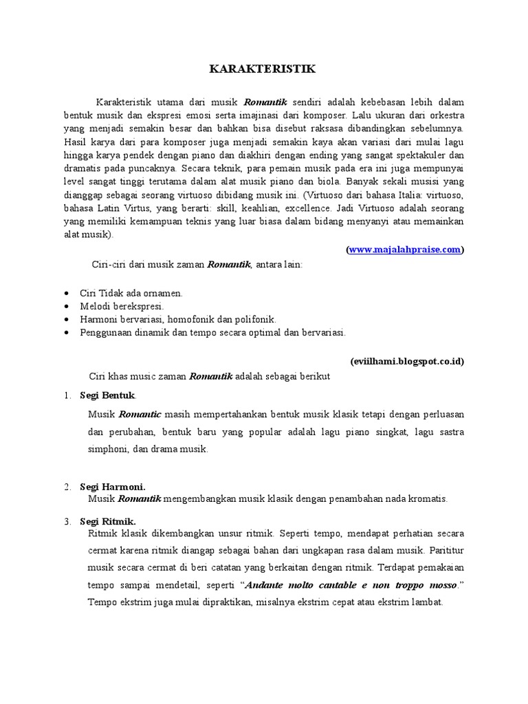 Pertama tidak sedikit bentuk komposisi yang bersifat miniatur. Ciri Khas Musik Zaman Romantik Ciri khas musik zaman romantik adalah sebagai berikut. Dimainkan di pentas oleh sejumlah besar pemain musik penyanyi.
